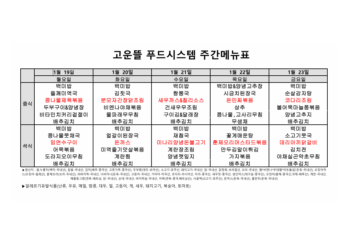 고운뜰푸드 1월 4주차 식단표